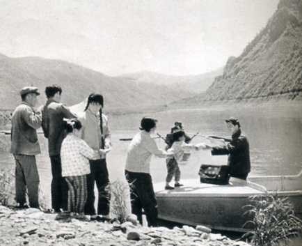 乘气艇为沿江村队送邮件,人们听见摩托声,便赶到江边取信件、报刊。