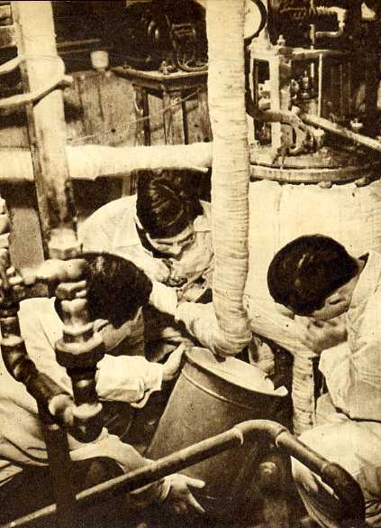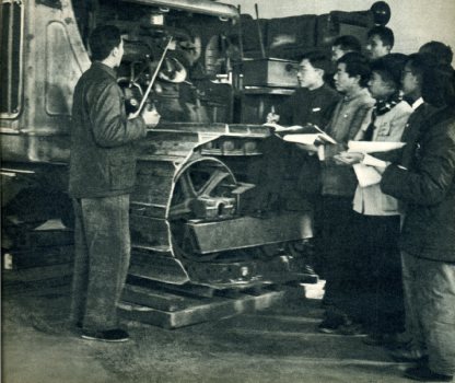 长春汽车拖拉机学院汽车拖拉机专业的学生在听助教讲解斯大林—80号拖拉机的构造与性能。