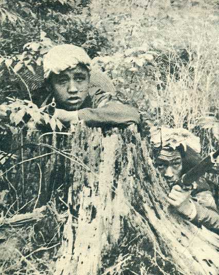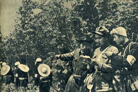 吉林省蛟河县第二区黄松甸村民兵在附近的铁路上巡查,他们担负保护铁路、公路、仓库等国家建设和财富的任务。