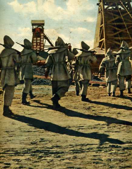 一天的工作结束后,工人们洗完了澡,正由医生洗涤眼睛。