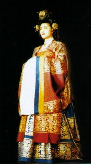 朝鲜族传统服饰。此为红园衫,是太子妃在正式场合的大礼服,上衣缀织金圆形五爪龙补,其它纹饰为云纹、凤纹、花草纹,腰系织金红色腰带,装束雍容华贵。