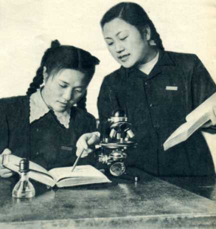 国内许多兄弟大学积极地支援年青的延边大学。这是北京师范大学儿童心理学教授朱智贤(右)指导在该校进修的延边大学助教林东虎。