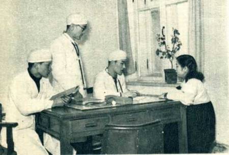 医学院三年级学生元容益(右起第二人)和朴龙泽(左起第一人)在延边医院实习。