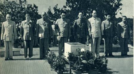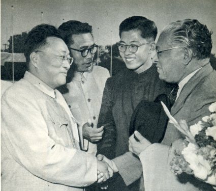 以克•科里亚爵士为首的锡兰政府代表团和我国政府就建立外交、经济、文教关系发表了联合公报。图为克•科里亚爵士到达北京时受到我国外交部副部长章汉夫(左)的欢迎。(1956年)