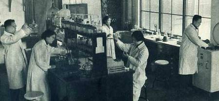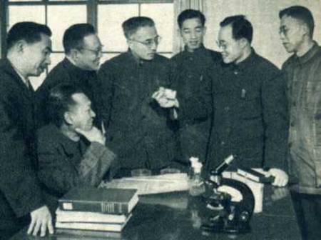 科技人员在对有关金霉素的研究和生产作进一步的探讨。从左至右:中国科学院有机化学研究所研究员黄耀曾,中国科学院植物生理研究所副所长殷宏章,上海工业试验所发酵组主任金培松,上海第三制药厂副厂长童村,中国科学院植物生理研究所副研究员沈善炯、汪猷,上海第三制药厂研究室副主任刘璞。