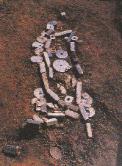 武进寺墩3号墓玉器出土情况。百件以上的玉器随葬在墓内,大部分环绕身体陈放,从而窥知新石器时代葬的真貌。1982年发掘。