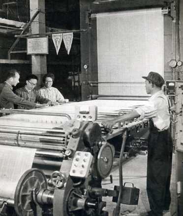 在中共常州市委的领导下,全市组成了八条生产协作线,充分发挥了社会主义企业的积极性。图为灯蕊绒生产协作线的有关单位的代表,正在研究进一步提高产品的质量。