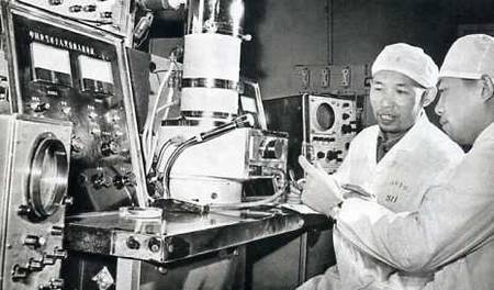 电讯电机厂工程师陈理璧(右一)主持设计、研制成了步进电机。这是他在研究有关数据。