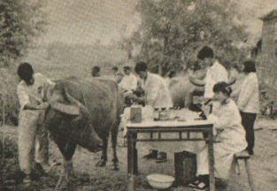 下放在江浦县兰花公社劳动的南京农学院兽医系师生,帮助公社建立了牲畜人工授精站,为耕牛配种。(1960年)