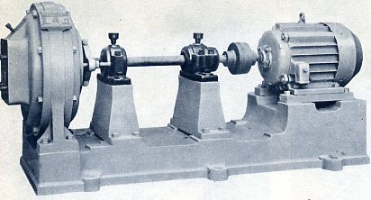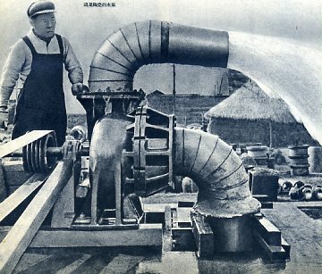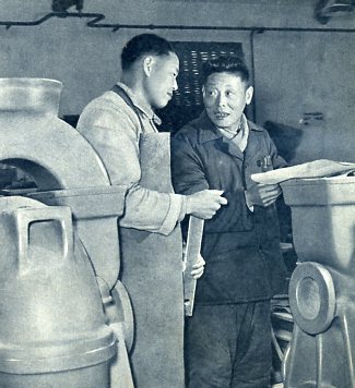 工人出身的宜兴化工陶瓷厂付厂长顾浩元(右)和工人陈金元是宜兴首创陶瓷机械的人。现在正在检查新制出的5马力鼓风机。