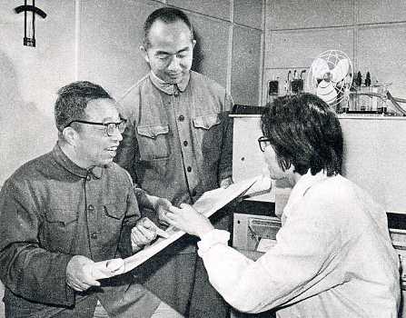 唐敖庆教授同江元生(中)等一起研究一种分子的光谱图。
