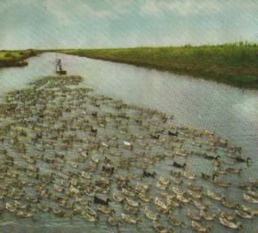 宽阔的灌溉总渠,是放牧鸭群的好地方。这个景色优美的地方,就是著名的滨海百里家禽场。这个家禽场,西起西沟,东至黄海边,全长102里,共饲养着各种家禽60余万只。(1960年)