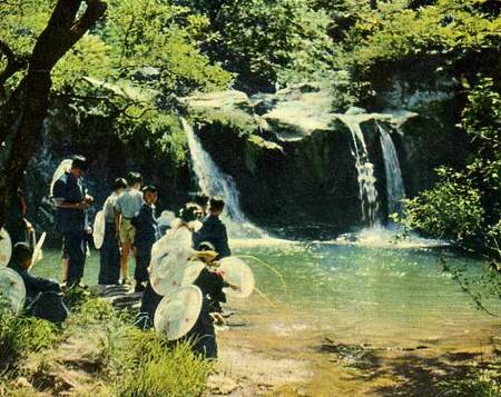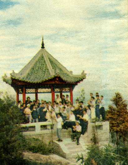 庐山中南总工会工人休养所的工人们,在“花径”—庐山名胜之一游玩。工人乘兴向伙伴们演唱民歌。