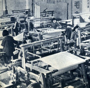 江西南昌县“八一”人民公社的染织厂。350多工人大都是离开家务不久的妇女,所织布匹90%合乎一等品标准。(1959年)