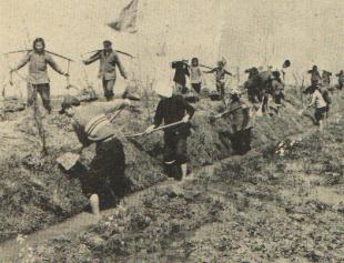 “八一”公社“八一”大队的两个小队—罗巷和陈何,在全省农业“群英会”之后,掀起劳动竞赛,正式签订了竞赛合同。在订合同的第二天,陈何突击积肥,每人每天平均积肥120担,工效猛增一倍。(1960年)