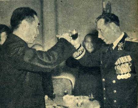 1951年11月7日,在苏联驻华大使罗申举行的招待会上,周恩来向罗申大使祝贺苏联十月革命34周年。