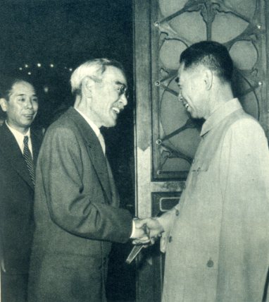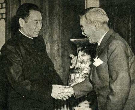 周恩来总理在1955年7月25日举行了盛大酒会,招待前来访问的各国和平代表。图为周总理和大山郁夫握手。左一是日本和平代表团团长高桑纯夫。