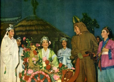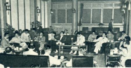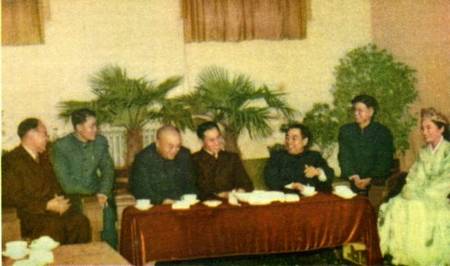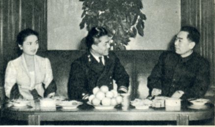 朝鲜青年艺术团1955年10月初应邀来我国,在哈尔滨、济南、上海、北京等八大城市演出了精彩的五幕歌剧《孔菊与潘菊》,受到我国人民的热烈欢迎。图为周恩来(右三)和彭德怀(右五)接见朝鲜青年艺术团团长崔文歧(右四)和部分团员。