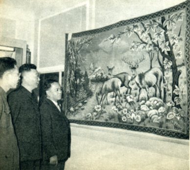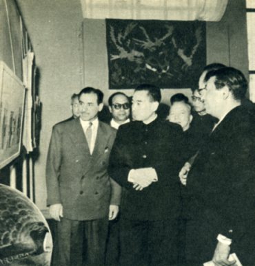 周恩来在埃及驻华大使拉加卜(左一)的陪同下,参观埃及艺术展览会。
