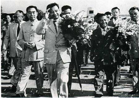 1956年8月20日至26日,老挝首相梭发那·富马亲王率政府代表团访问中国。图为周恩来、陈毅等到机场欢迎。