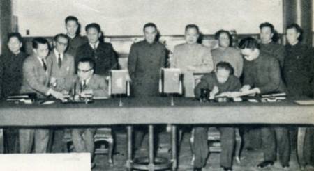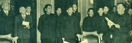 中华人民共和国中央人民政府与捷克斯洛伐克共和国政府之间,于5月6日在北京签订了四项对发展两国间文化与经济合作具有重大意义的协定,即中捷文化合作协定、中捷邮政协定、中捷电信协定及中捷科学与技术合作协定。图为中央人民政务院副总理郭沫若在协定举行签字仪式时讲话致贺。第一排左起:捷克斯洛伐克共和国政府代表团团员诺曼博士、团长柯别茨基、中央人民政府政务院总理周恩来、副总理陈云、文化部部长沈雁冰。