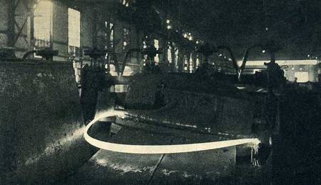 图为自动化的反围盘代替了以前用人力挟钳高温钢的繁重劳动。