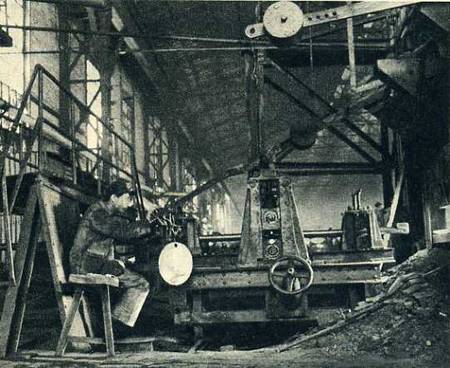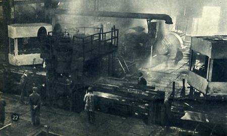 图为过去从加热炉里用人力取钢的工作,现在已被自动抽钢机代替了。