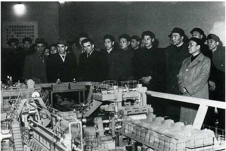 鞍山钢铁公司技术革新展览会在北京举行。图为李富春副总理(前右一),全国总工会主席赖若愚(前右二)和外宾一起参观新型无缝钢管厂的模型。