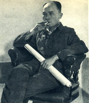 鞍钢的一座正在改建中的自动化高炉。它是由重工业部黑色冶金设计院负责技术和施工的。设计院的代表季景熙(中)和工地主任季德文(右)在视察施工情况。