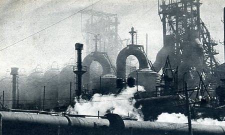 图为鞍山钢铁厂工人为完成国民经济恢复的任务而紧张工作。