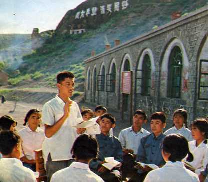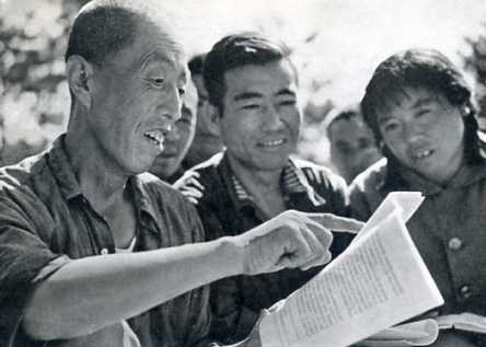 老贫农王贵彬(左)五十二岁上大学,他从朝农培训班毕业回后,带领群众深入开展农业学大寨运动,为改变家乡面貌做出了贡献。这是他同社员一起学习无产阶级专政理论。