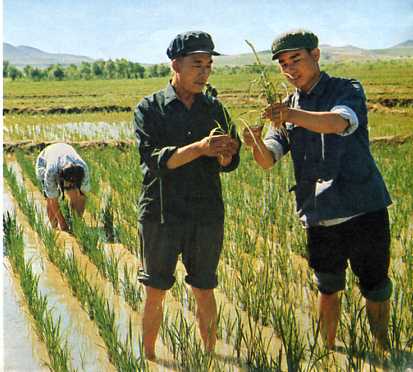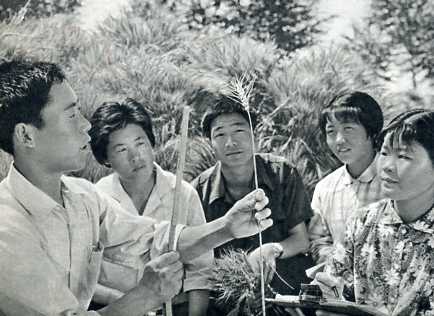 朝农党委努力建立一支以贫下中农为主体的教师队伍。杨景龙(左)从朝农毕业后,被聘为兼职教师。这是他和小麦课题组的师生一起进行科学研究。