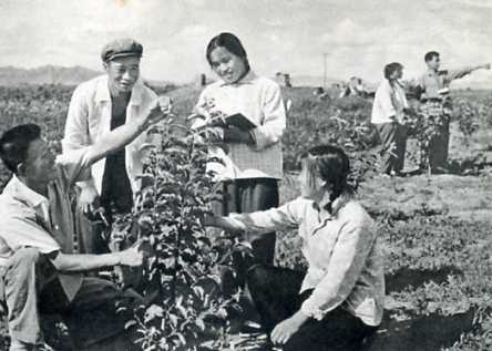果林系师生深入大队,同贫下中农一起研究苹果的矮化栽培。