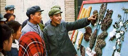 王文有(右)从朝农毕业回后,和社员一起在培育新品种、改造盐碱地等科学研究方面取得了好成绩。这是他以部分科研成果向社员进行科学知识的教育。