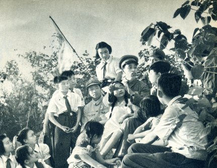 北京八一小学的学生听高玉宝讲“半夜鸡叫”(“高玉宝”里的一章”)的故事。