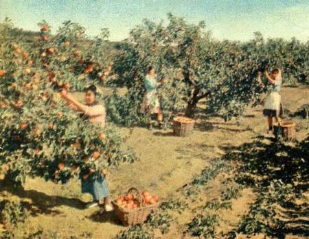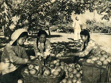 旅大区金县王洪源果树生产合作社的社员们正在收摘着他们劳动的果实。