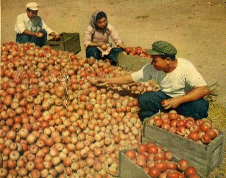 旅大市是东北盛产苹果的地区,今年苹果又获得丰收。这是旅大国营第一农场的工作人员,在果园里把摘下的苹果挑选装箱。