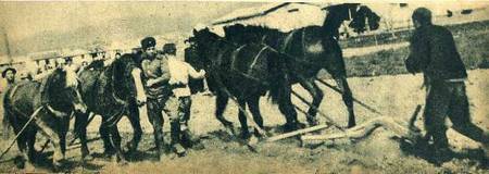 苏联红军和他们的战马帮助农民春耕,中苏人民的伟大友谊表现在每一处与每一件事情上。