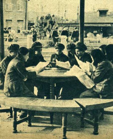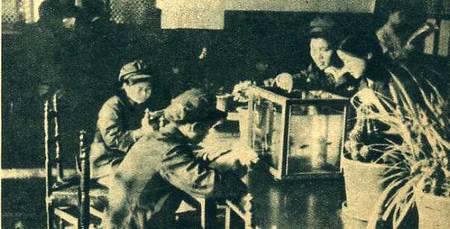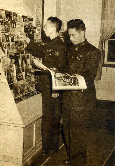 大连交通公司工人宿舍—“工人之家”是设备齐全的宿舍,休息时间工友们在庭院里读报。