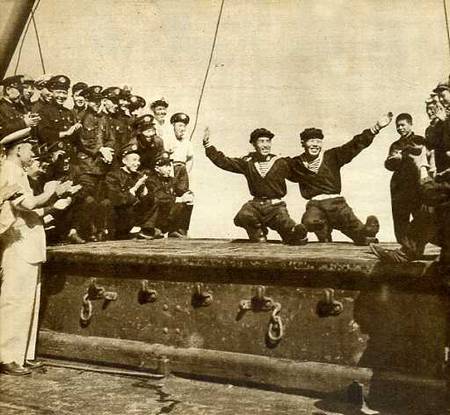 当航行结束时,在甲板上经常举行各种表演会,海员们生活在团结、友爱的气氛中。