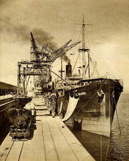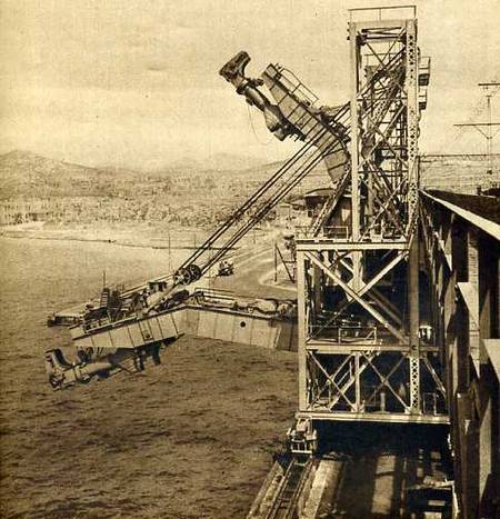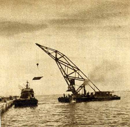 海中起重机正将180平方尺重达8吨的钢板装上货轮。这种起重机每次可以装卸25吨。