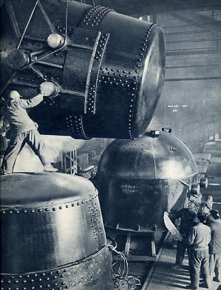 大连工矿车辆厂的工人在给包钢、武钢等单位制造65吨铁水车罐。