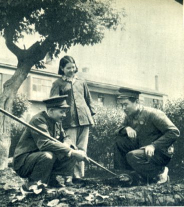 闻德(右)过去和李春荣在一个连队作战,复员后也参加了抚顺煤矿的劳动。他是抚顺市的治安模范,常来和老战友聊天。