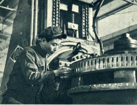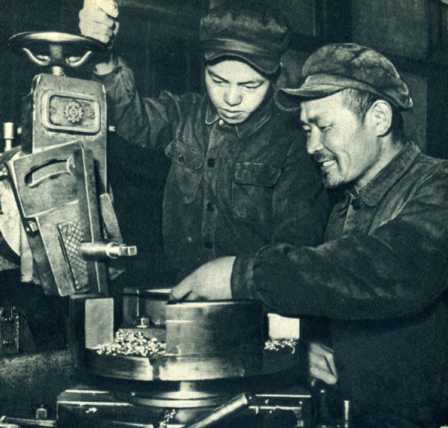 抚顺市劳动模范金海(右)是20年前开始到这个厂为做工的。去年制造大牙轮时,他和伙伴们共同创造了一种代用工具,为国家节省了1万元,而且提前63小完成了生产任务。
