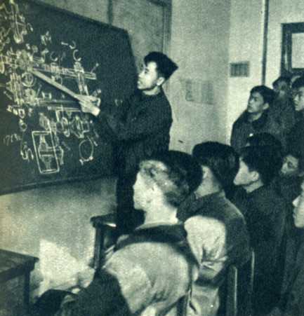 这些青年工人正在本厂的技工训练班学习电铲的装配技术。