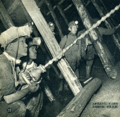 瓦斯排出以后,矿工们在安全地打眼,准备放炮。