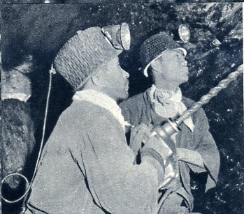 老虎台矿全国先进生产者庞观祥(右)和全班工人在第一个五年计划期间曾为国家增产89000多吨煤,而今年一年就将增产34500吨。