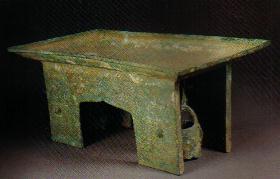 商晚期 双铃兽面纹俎。长33.6厘米,宽17.7厘米,花尔楼村出土。俎是切肉的案。商代发现有石、陶制俎,铜俎则极少见。