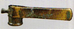 (商)戚。弦纹式,14.5厘米,大红旗村出土。这种近于钺斧形的武器,有銎孔用以巩固柄部,效果明显优于商周时期的戈、钺。