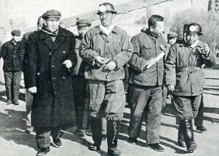 中央代表团事团长、国家经委副主任郭洪涛(前左一)在石炭井矿务局三矿看望回、汉族煤矿工人。